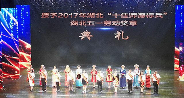在武汉音乐学院东方交响乐团开场演奏的《红旗颂》序曲后,展演现场播放2017 年湖北省“十佳师德标兵”视频,并进行表彰颁奖典礼。湖北省总工会、湖北省教育厅领导为华中师范大学万莉等10 名高校、中小学教师颁发2017 年湖北省“十佳师德标兵”“湖北五一劳动奖章”。我院马克思主义学院青年教师杨永华名列其中,这也是我校教师首次获此殊荣。