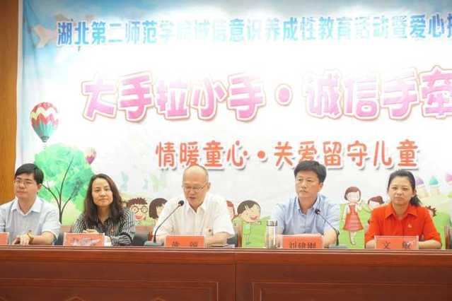 本网讯(通讯员 余婵)为更好促进青少年诚信意识养成,更好服务青少年成长成才,5月28日,“大手拉小手,诚信手牵手”湖北第二师范学院诚信意识养成性教育活动暨爱心捐赠仪式在罗田县凤山镇栗子坳小学举行。湖北第二师范学院党委常委、副校长黄颂,罗田县政府党组成员、县理工中专校长刘建刚,县教育局局长叶丛飞出席。