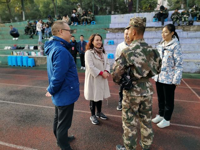 本网讯(通讯员余婵)11月10日以来,我院学生在学院领导老师和教官的指导下积极投身训练。11月18日下午,我院党总支书记尹德蓉、党总支副书记宋平、学工办主任樊勇、辅导员王一一行进行新生军训走访。