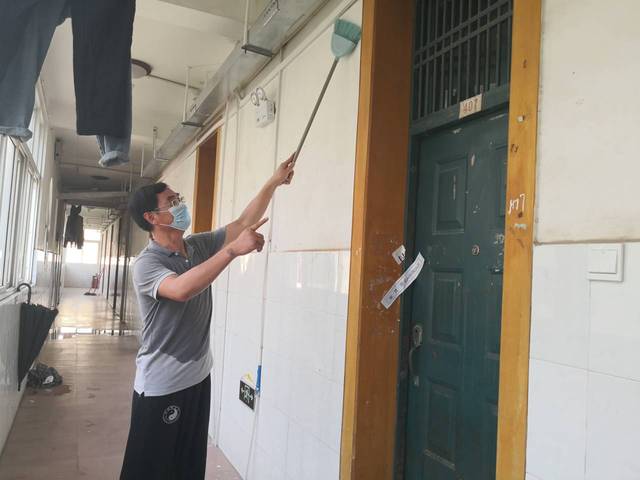 6月18日上午,刚刚结束6月份支部主题党日活动的集中学习,全体党员就由教工支部书记肖潇、刘雯带队,备齐清扫工具,全副武装来到中区1栋4、5层和4栋6层,热情高涨、干劲十足地投入到清扫学生宿舍楼的劳动中。16日下午,行政人员曾经来清扫过一次,但是由于中区宿舍外墙构造与其他宿舍楼不同,玻璃窗特别多,合适的工具准备不足,效果不太理想。“今天的擦玻璃神器还可以!……这个墙壁的瓷砖要先喷湿,用刮刀铲一下污垢,再擦才会更干净……”党总支书记尹德蓉忙碌着给大家示范如何使用工具。“门上的窗户金属框要用干净扫帚把灰先掸下来,灰尘下来了最后再清理地面……”院长黄红发不顾灰尘落了一头一脸,双手举着长杆打扫门框。连宿管阿姨都忍不住拿出手机拍照,夸赞道 “你们准备的真好,做的又仔细,这样清理才真的干净!”窗户明亮了,楼道清爽了,扶手干净了,看着劳动成果,大家疲惫的脸上都露出了欣慰的笑容,为了学生的卫生安全和身体健康,再累也甘愿!