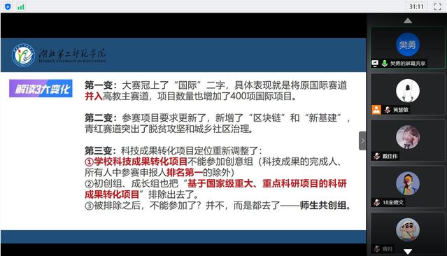 接着,樊勇对此次大赛进行详细介绍。他首先对第六届互联网+创新创业大赛文件进行详细解读,介绍比赛宗旨和赛程安排,指出比赛的三大变化,并讲解了往届部分选题,着重强调大赛的重要性。同时,他通过展示商业计划书,指出项目计划书要有整体逻辑性,并对计划书的写法提出指导性建议。