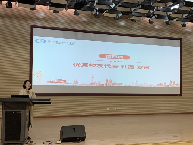 随后,我院优秀校友代表杜薇发言。她结合自身经历向新生传授自己的学习经验与阅读技巧,勉励新生在学习中走专业化道路,始终保持专心的态度。