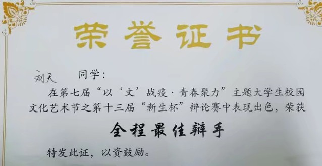 我院辩论队在我校第七届届“以‘文’战疫·青春聚力”校园文化艺术节之第十三届“新生杯”辩论赛决赛中荣获冠军。