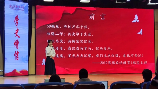 此次活力团支部评选活动分为支部学“习”成果展示和支部风采展示两个环节。团支部主讲人刘玉洁首先以《百马悟行,使命向新》为题,作活力团支部学“习”成果展示,展示内容包括学思仰高、身惕衷正、诚志弘毅和笃实践行四个部分,分别展示了支部思想建设、组织建设、活动开展、社会实践等成果。在支部风采展示环节,团支部采用新闻播报的形式,情景再现了“百马行动”宣讲团赴赤壁开展宣讲活动、“黄大年”式的教师团队给学生上思政课、守望诚信志愿服务队开展支教活动的场景,向观众展示了团支部的风采与活力。