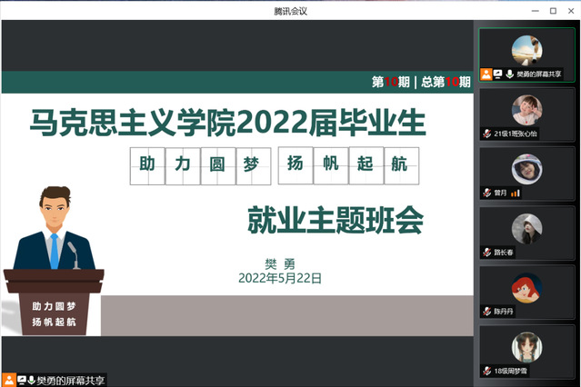 本网讯(通讯员 张心怡)5月22日晚,我院于线上腾讯会议召开2022届毕业生第十期“助力圆梦,扬帆起航”线上就业主题班会。我院学工办主任樊勇主持会议,2022届思想政治教育专业全体毕业生参加。