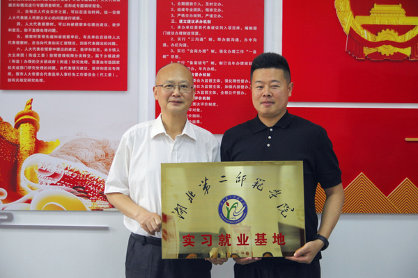 黄红发代表学校与蒲纺工业园签订合作协议;黄颂为“湖北第二师范学院蒲纺工业园实习就业基地”授牌。