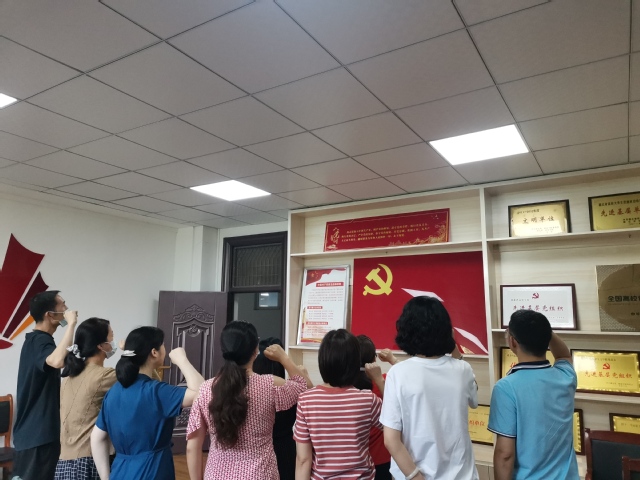 教师党支部书记曹芸同志带领参加活动的党员,面向党旗,庄严宣誓,表达了全体党员对党忠诚,为共产主义奋斗终身的坚定理想信念。