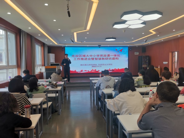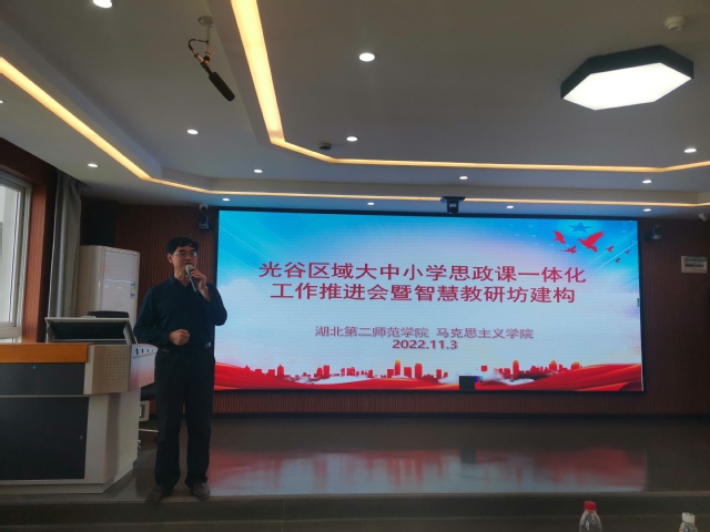 本网讯(通讯员王顺双)2022年11月3日上午,湖北第二师范学院马克思主义学院组织全体教职工在1号教学楼数字马院召开了光谷区域大中小学思政课一体化建设推进会议。会议由马克思主义学院院长、光谷区域大中小学思政课一体化教学与实践研究中心负责人黄红发主持。