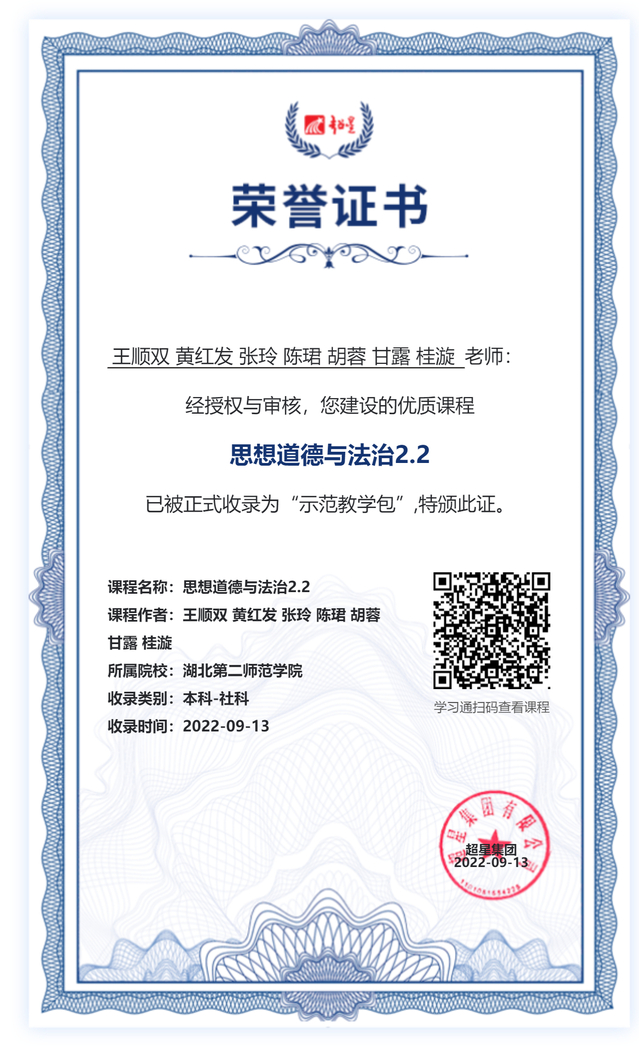 本网讯(通讯员王顺双)近期,由湖北第二师范学院马克思主义学院王顺双负责的光谷区域大中小学思政课一体化共享资源课《思想道德与法治》,经超星集团审核与授权,收录为本科社科类“示范教学包”。该课程资源,是光谷教师教育综合改革省级实验区重点工程“推进大中小学思政课一体化建设”、重点课题“推动光谷区域大中小学思政课法治教育一体化工作的路径研究”的阶段性成果。