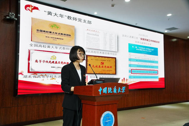 “黄大年”教师党支部书记刘雯代表党支部在大会上作“创新‘党建+’机制 倾力立德树人”主题分享。刘雯介绍党支部发展历程以及所获荣誉,从创新“党建+教育教学”机制,深化思政课改革、创新“党建+专业建设”机制,建设一流专业、创新“党建+育人”机制,提高育人质量三方面分享党支部在党建工作中的创新经验,以及在创新党建工作之中不断落实思政课立德树人的根本任务。会议发布《湖北省以英雄人物命名的“全国高校党建工作样板支部”倡议书》。