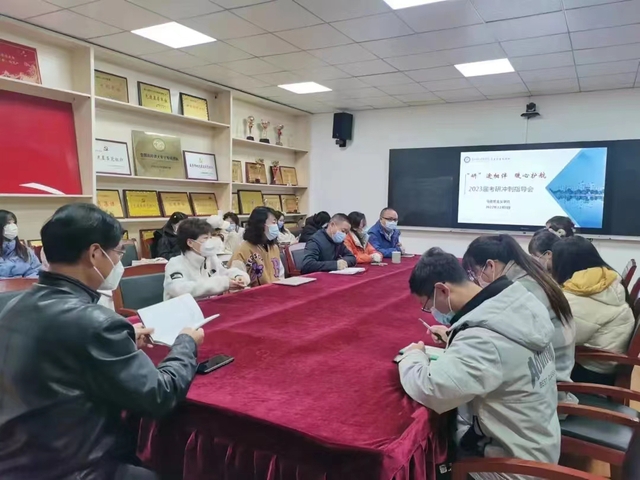 本网讯(通讯员赵迅)12月8日晚上,湖北第二师范学院马克思主义学院于二号楼二楼会议室召开“‘研’途相伴·暖心护航”2023届考研冲刺指导会。马院党总支书记金殿中,院长黄红发,副院长蔡志荣,指导老师田磬、原琳,学工办主任樊勇以及2019级思想政治教育专业全体考研学生参会。