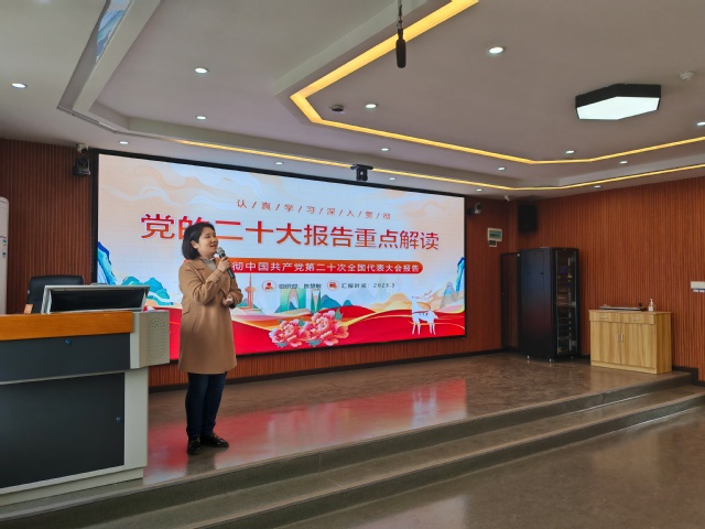 组织部常务副部长陈慧敏作专题宣讲,她深刻解读了党的二十大精神的具体内容及深刻内涵,使同学们对党的二十大报告有了更加深刻的了解。“坚持马克思主义,必须发展马克思主义,不断用发展着的马克思主义指导新的实践。党的百年历史证明,坚持守正创新,不断推动马克思主义中国化时代化,发展和运用马克思主义引领实践,是我们党带领人民创造历史伟业的一条十分重要的历史经验,也是奋进新征程、建功新时代,奋力夺取全面建设社会主义现代化国家新胜利的根本遵循。”,她在宣讲中说道。