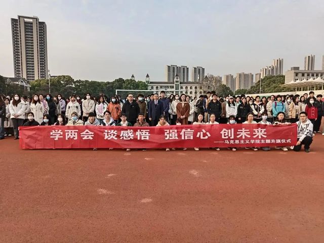 3月27日早上,马克思主义学院于足球场升旗台前举行“学两会·谈感悟·强信心·创未来”主题升旗仪式。马克思主义学院党总支书记金殿中,党总支副书记李佳,学工办主任樊勇,2020级、2021级、2022级思想政治教育专业学生参与活动。2022级思想政治教育1班张晟瑜主持仪式。