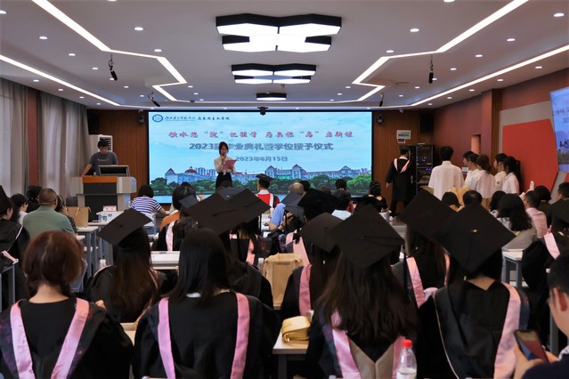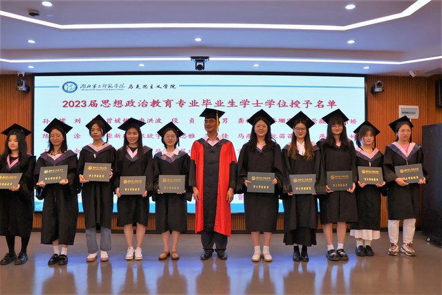 本网讯(通讯员赵迅)6月15日上午,马克思主义学院于一号教学楼6楼数字马院举行“饮水思‘院’忆往昔 厉兵秣‘马’启新程”2023届毕业典礼暨学位授予仪式。组织部副部长姜娜、卢郅睿,马克思主义学院党总支书记金殿中、院长黄红发、党总支副书记李佳、副院长蔡志荣、刘雯,全体教职工以及2023届毕业生参加典礼。2020级思想政治教育1班陈露担任主持人。