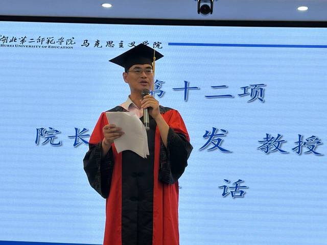 学院院长黄红发教授发表讲话,他代表学院向2023届学子圆满完成学业、获得双证表示热烈祝贺。他谈到:四年里,19级学生在马院的洗礼和锻造下,逐步成长为一个具有坚定政治信仰和高尚师德情怀的大写的思政人,见证了马院的长足发展。黄红发期待同学们做到以下几点:一是信任自己,对自己充满信心;二是锤炼自己的品德和修为;三是砥砺奋斗,做有理想,有作为,有担当的时代青年。