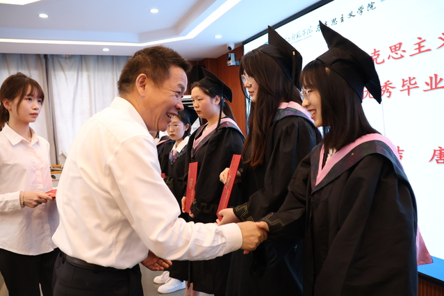 随后,陈露宣读表彰2023届毕业生学士学位、优秀毕业生、优秀实习生的决定;黄红发为马克思主义学院2023届毕业生颁发学士学位证书并拨穗;金殿中为2023届优秀毕业生颁发证书并赠送纪念品;姜娜为优秀实习生颁发证书;卢郅睿为西部志愿者颁发证书并赠送纪念品;蔡志荣为校友联络员颁发聘书。