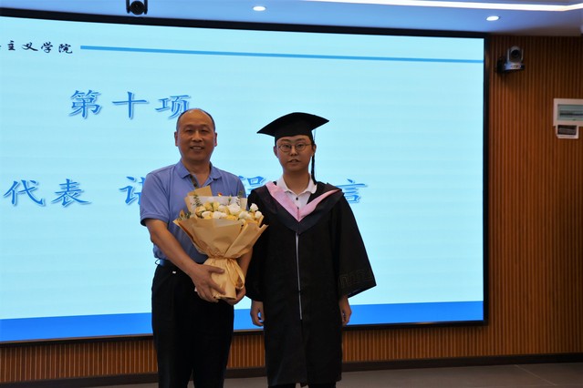 2023届毕业生为即将退休的宋平老师偷偷送上精心准备的鲜花。宋平感慨道,希望各位同学和自己都可以开始新征程、新生活、新人生,在未来生活中发扬马克思主义学院团结奋斗的精神,在新征程中更进一步。