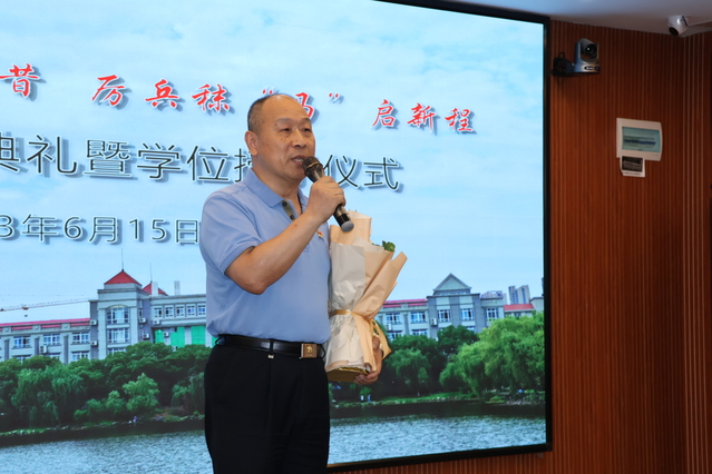接着,2023届优秀毕业生2019级思想政治教育1班谌鹏程代表发言。他表示,四年的大学时光总是温暖的,父母、老师以及朋友陪着我成长,使我敢于面对挫折与磨难,感恩党和国家为我们提供和平安定的社会环境,感恩母校为我们创造安心求学的学习环境。
