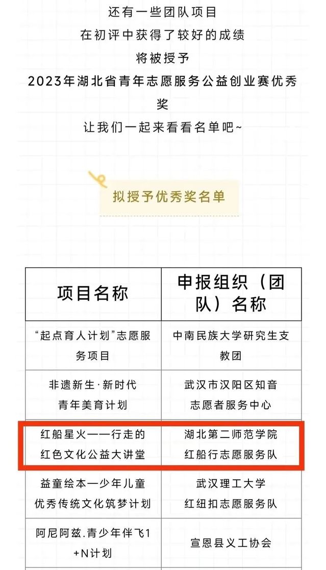 近日,2023年湖北省青年志愿服务公益创业赛决赛在华中师范大学举行,马克思主义学院红船行志愿服务队的项目《红船星火——行走的红色文化公益大讲堂》从全省近160个项目中脱颖而出,荣获大赛优秀奖。本次获奖也是继2021年后再次获得该赛事奖项。