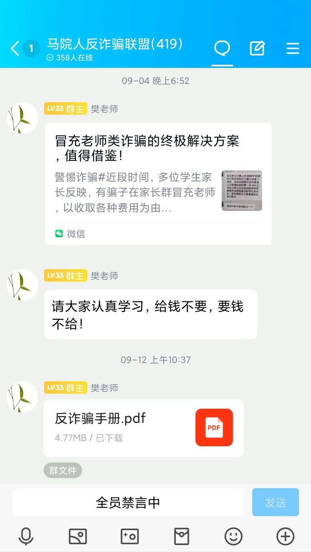 除此之外,马院在樊勇的牵头下组建“马院人反诈骗联盟”QQ群,樊勇会定期在QQ群发送反诈小提醒、国家反诈中心、工信部反诈中心提示等等内容,向同学们传递实时热点,提醒同学们警惕各种新型诈骗手段。