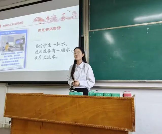 其中,2022级思想政治教育3班张颖彤以婉转悠扬的声音将诗歌作品《启明星》的思想感情淋漓尽致地展现出来,将老师比作散发着真理光芒的启明星,以传播知识为己任,表达了对老师的赞美之情。2022级思想政治教育3班王欣雨以“俯首育桃李,润物细无声”为主题展开演讲,赞扬了教师的无私奉献。她以自己为实例表达了被好老师教导的幸福,并表示自己想要成为一名无论在生活中还是在学习上都能引导学生向上向善的好老师。