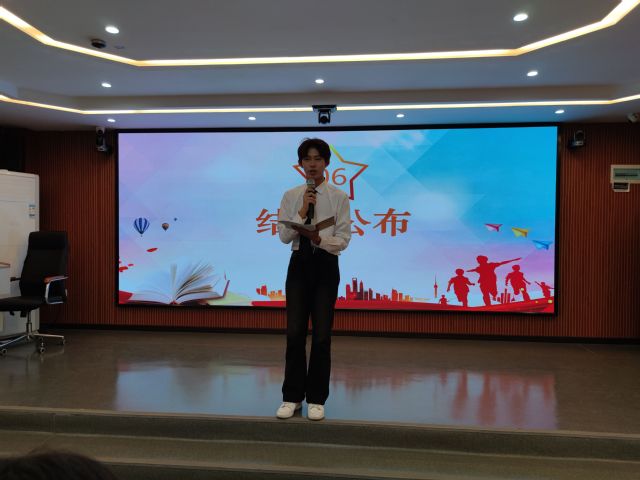 主持人宣读比赛结果:一等奖:蔡诗瑶;二等奖:张和雷、杨英琦;三等奖:刘俞麟、金玉、李亚斌;优秀奖:王盈盈、姚颖、谭潇、段子扬、靖佳琪。