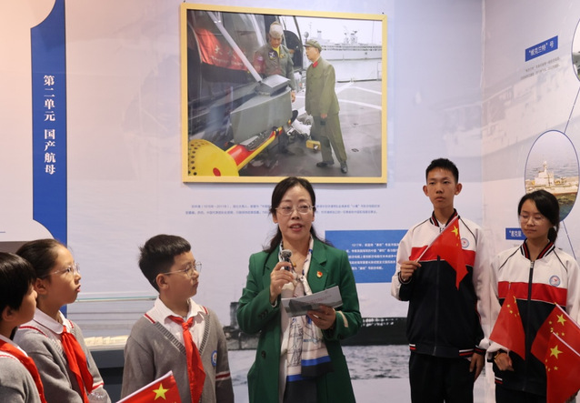 接着,师生们来到了“圆梦深蓝——从四大名舰看中国海军的崛起”展览厅,开展“舰证百年历史,逐梦海军强国”教学活动。在参观四大名舰“致远舰、中山舰、长江舰和山东舰”图片展的过程中,师生们重温中国海军百年的发展史。光谷十二小的马念老师讲述了定远舰舰长邓世昌在中日甲午战争黄海海战中与舰同沉,最后壮烈殉国的故事。湖北第二师范学院的刘志来、吴文娟、叶道艳、尚峰老师,武汉海事职业学院的喻微、彭莹老师,讲解了从旧中国到新中国海军主要舰艇的发展过程和基本情况。湖北第二师范学院蔡志荣教授,从航母之父刘华清的故事切入教学,讲解新中国海军从无到有、从弱到强的历程,解读海军强国战略。武汉光谷第三初级中学的万惠敏老师,勉励同学们向核潜艇之父黄日华院士学习,树立报效祖国的崇高理想。同学们在领悟新中国海军现代化历程中,增强了建设社会主义现代化强国、实现中华民族伟大复兴的信念和信心。