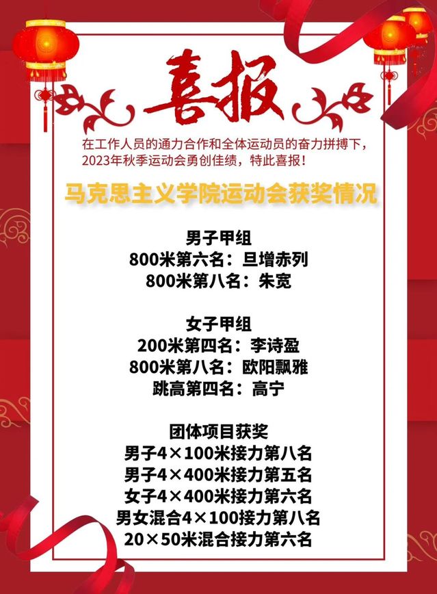 10月27日,我校2023年秋运会落下了帷幕。在为期两天的运动会中,马院的运动健儿们勇往直前,奋勇拼搏,尽显青春活力。一份耕耘,一份收获,拼搏的汗水终凝结成了胜利的果实,他们,用自己的努力为马院挣得了荣誉。