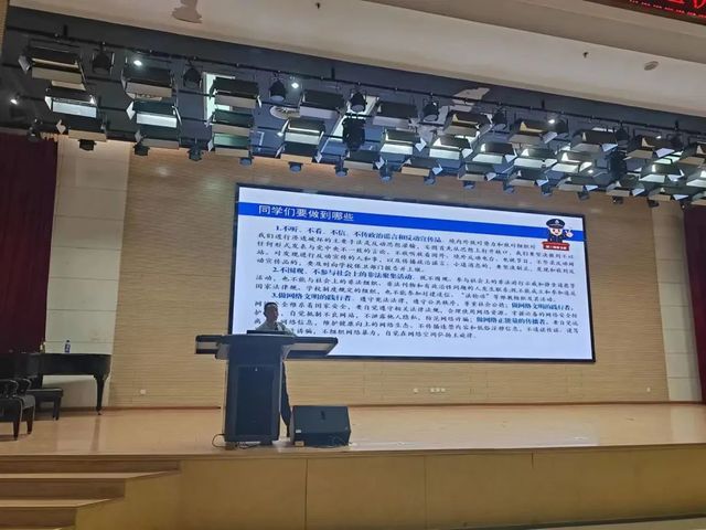 会议伊始,主持人介绍讲座目的为切实加强学生安全意识,提升安全管理水平和防止事故发生。随后,保卫部副部长熊寅墨作为主讲人上台普及安全知识。他的讲话主要分为以下三点:一是,安全是人类最基本的需求,也是最基础的生存条件。人的生命是最宝贵的,希望同学们能提高自我保护意识和能力。二是,校园治安是营造良好大学生活氛围的重要举措。警惕盗窃、损坏公私财物、吸食毒品和管制药品、涉两卡违法犯罪诈骗、传销和校园贷、寻衅滋事等危害校园安全的行为。三是,注意交通,事故无踪;心系安全,幸福久远。应提高交通安全意识,遵守交通法律法规。