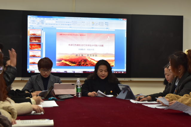 最后,师生们聚集在湖北第二师范学院马克思主义学院会议室,开展实践心得分享与交流活动。在桂漩、卢芳、曹芸、肖潇四位老师的主持下,师生们分别围绕“乡村振兴战略”和“黄麻起义精神”两个主题展开思想交流与习得分享。分别围绕着乡村振兴战略中如何传承红色基因,如何看待脱贫攻坚、全面小康和共同富裕三者之间关系,以及红安黄麻起义精神所蕴含的马克思主义基本原理等问题与同学们展开讨论。桂漩老师表示,红安人民深刻传承着黄麻起义的“万众一心、紧跟党走、朴诚勇毅、不胜不休”的精神基因,在红色基因传承、乡村振兴的道路上都一往无前、不胜不休,续写着独属于红安人民的时代新篇章。同学们也纷纷表示,通过本次实践教学活动,不仅加强了对于红安革命文化的了解,更深切感受到在党的正确领导下,红安人民的积极探索和不懈奋斗的精神。