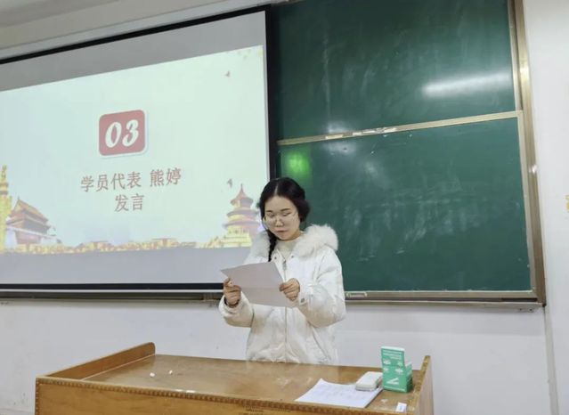 紧接着,2022级思想政治教育1班的熊婷代表培训班全体同学发言。她代表全体学员做出郑重承诺:一是在培训过程中按时上课,认真听讲,仔细做笔记;二是端正入党动机,做好为人民服务的觉悟;三是主动完善自己,积极向党组织靠拢,做合格的社会主义建设者和接班人。