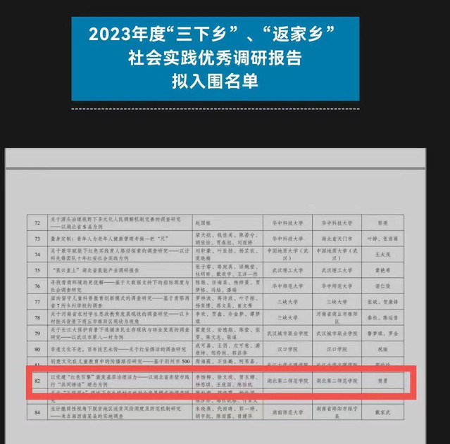 近日,团中央公布2023年度“三下乡”“返家乡”社会实践优秀调研报告评选结果,马克思主义学院樊勇老师指导的《以党建“红色引擎”激发基层治理活力——以湖北省赤壁市践行“共同缔造”理念为例》获社会实践优秀调研报告。值得一提的是,全国仅有120篇作品入选,全校有且仅有马院一篇作品入选。