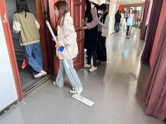 活动开始前,李佳按照班级划分清扫区域,各班劳动委员有序领取劳动工具并分配小组任务,各小组迅速到达指定任务地点展开劳动。一组人在数字马院教室内,一组人在数字马院教室外,马院学子们劳动忙碌的身影和朗朗晴天在校园里闪闪发光。