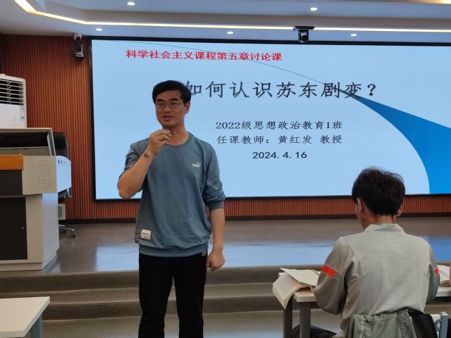 4月16日晚,湖北第二师范学院马克思主义学院2022级思想政治教育1班,在《科学社会主义》课程任课教师黄红发教授的指导下,于一号教学楼数字马院开展“如何认识苏东剧变”讨论课。