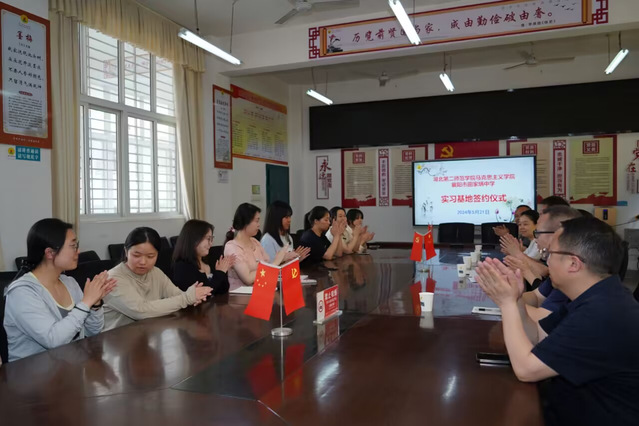 马克思主义学院邱海燕老师对襄阳市田家炳中学领导老师为马院学生提供的宝贵实习机会和高质量的指导表达了感谢,9位实习生在田家炳中学获得了实实在在的教学体验,得到了真切的教育成长。单馨怡同学代表实习生对在田家炳中学度过一段美好而充实的实习生活表示了感谢。随后,双方代表签订协议并合影留念,田家炳中学作为湖北第二师范学院思想政治教育专业优质实习基地,多年来为马克思主义学院师范生教学技能训练和思政课实践育人提供了有力支持,两校将以此为契机,促进两校的深度合作与交流。