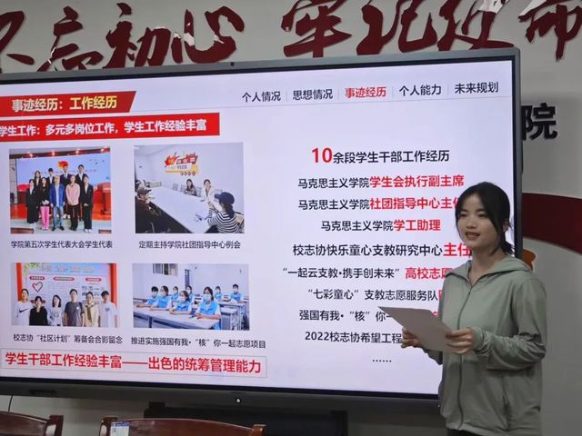 其中,2021级思想政治教育2班陆火云从个人情况、思想情况、事迹经历、个人能力及未来规划展开答辩。她积极参与学生工作,学习刻苦努力,注重素质素养及个人能力培养,获得许多省级奖项及校级荣誉。今后她将持续开展团队建设,做好总结工作,提升服务效能。