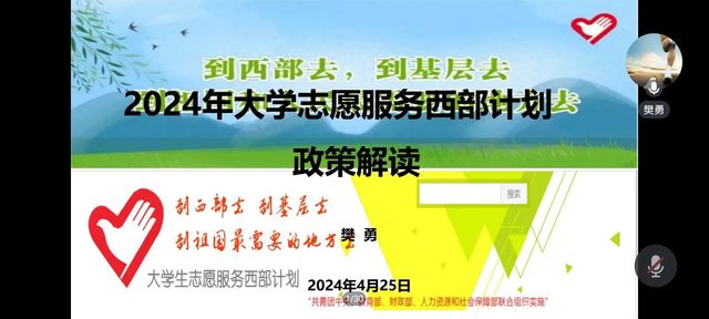 4月25日,马克思主义学院于线上开展2024年大学生志愿服务西部计划宣讲会。马克思主义学院2020级思想政治教育专业全体同学参加会议,分团委书记樊勇主持活动。
