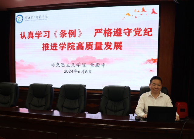 党总支书记金殿中以“认真学习《条例》 严格遵守党纪 推进学院高质量发展”为题,围绕党史中的纪律教育以及新《条例》背景意义、主要内容和学习践行等内容讲授纪律党课,重点剖析了违反党的政治纪律、组织纪律、廉洁纪律、群众纪律、工作纪律、生活纪律等六个方面的典型案例和具体表现,教育引导党员干部学纪、知纪、明纪、守纪,强化遵守纪律的政治自觉、思想自觉、行动自觉。金殿中强调,要涵养清风正气,锤炼品德修养,真正使学习党纪的过程成为提高党性修养的过程,在学院事业发展中充分发挥共产党员的先锋模范作用,强化责任担当,扎实推动党纪学习教育走深走实。