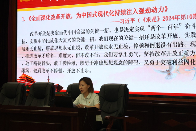 全体党员交纳6月党费后,由原琳同志带领全体党员诵读《中国共产党章程》第六章三十六条。接着,田磬同志带领学习习近平总书记重要文章《全面深化改革开放,为中国式现代化持续注入强劲动力》;习近平总书记对学校思政课建设作出的重要指示精神;习近平总书记在山东考察时的重要讲话精神;习近平总书记在中共中央政治局第十四次集体学习时的重要讲话;集中学习《中国共产党纪律处分条例》第九十四条至第一百二十九条;学习《中国共产党廉洁自律准则》《中华人民共和国公职人员政务处分法》以及省纪委监委通报5起群众身边不正之风和腐败问题典型案例;开展2024 年度领导干部学法计划学习等。