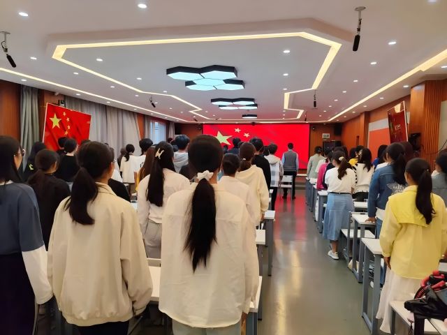 活动伊始,全体起立,奏唱国歌,随后,全体师生共同观看马克思主义学院新生军训纪录片。