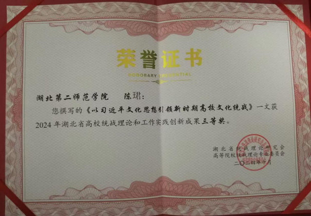 本次研讨会共收集来自34个会员单位的各类统战理论和工作实践成果230篇,评选表彰了优秀论文86篇,陈珺所撰写的论文《以习近平文化思想引领新时期高校文化统战》获三等奖。