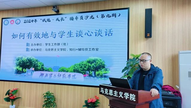 10月23日下午,第九期“赋能·成长”辅导员沙龙活动在马克思主义学院二楼多功能会议室开展。学生工作部(处)相关领导、老师和各教学学院辅导员代表参加。马克思主义学院党总支副书记李佳担任主讲人,学工办主任、知行+辅导员工作室主持人樊勇担任主持人。