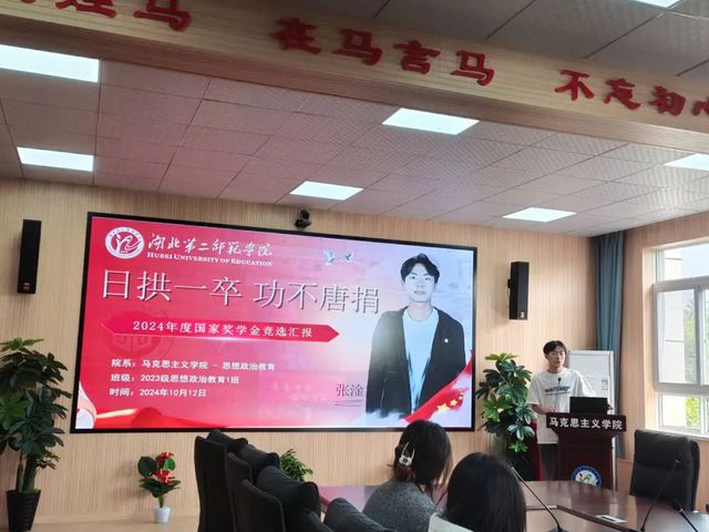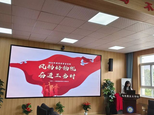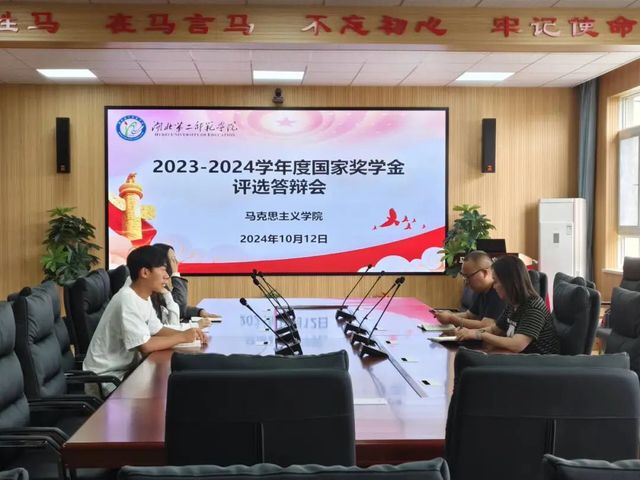 10月12日中午,马克思主义学院于二号楼二楼会议室开展2023-2024学年年度国家奖学金评选答辩会。马克思主义学院党总支副书记李佳、学工办主任樊勇担任评委。经过前期个人自愿申报,学院结合相关文件要求进行审查,2022级思想政治教育3班王欣雨、2023级思想政治教育1班张淦以及2023级思想政治教育1班杨忻童三位候选人参加答辩环节。参选人按照顺序进行现场答辩,从学习、生活等多个方面进行陈述。