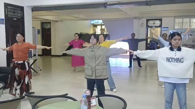 秋意渐浓,运动会也渐渐走近。10月17日中午,马克思主义学院刘雯、张改琴、原琳、杨永华、樊勇、尚峰、叶道艳、蔡志荣、孙晓敏九位老师在2号楼与同学们练习广播体操,共同奔赴运动会。