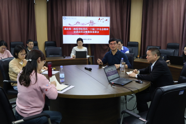 本网讯(通讯员孙晓敏)11月7日下午,湖北第二师范学院马克思主义学院在一号教学楼数字马院思政课堂研磨中心举办党的二十届三中全会精神宣讲动员会暨集体备课会。院党总支书记金殿中、院长黄红发、副院长蔡志荣、刘雯出席会议,校级宣讲团全体成员参加会议。会议由院长黄红发教授主持。