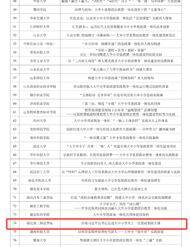 本网讯(通讯员王顺双)近日,教育部思想政治工作司公布2025年度高校思想政治工作质量提升综合改革与精品建设项目遴选结果,我校申报的《沿着习近平总书记足迹大中小学共上一堂思政实践大课》成功入选教育部“大中小学思想政治教育一体化建设工作典型案例”。