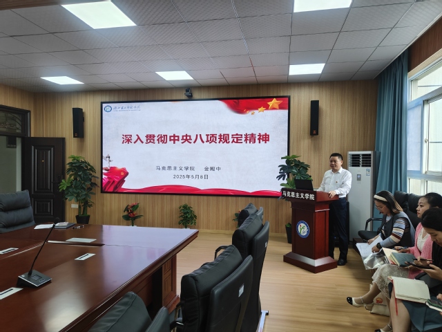 本网讯(通讯员何瑾)5月8日下午,马克思主义学院在会议室举行深入贯彻中央八项规定精神学习教育推进会。党总支书记金殿中以“深入贯彻中央八项规定精神”为题讲授党课,学院全体教师参加。