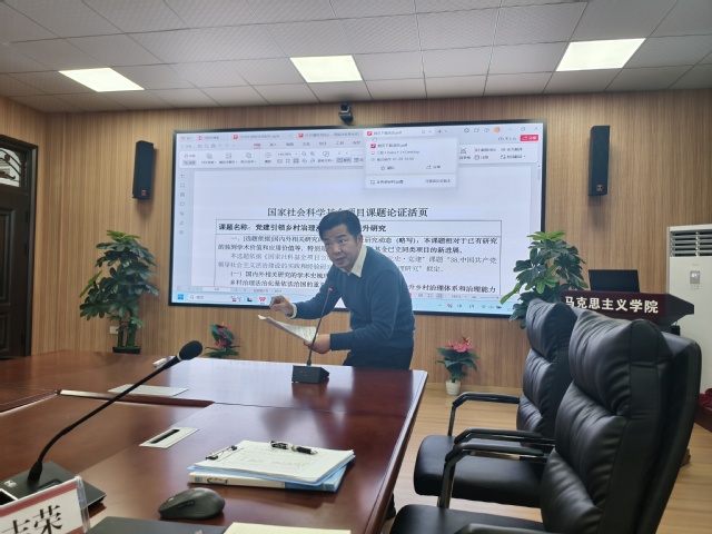 本网讯(通讯员孙天牧)为推进马克思主义学院高层次科研项目的申报工作,1月20日,武汉工程大学马克思主义学院院长曹胜亮教授,应邀来湖北第二师范学院马克思主义学院,作题为“国家社科基金项目申报的方法与体悟”的辅导报告。报告由黄红发院长主持,全体教师参加。