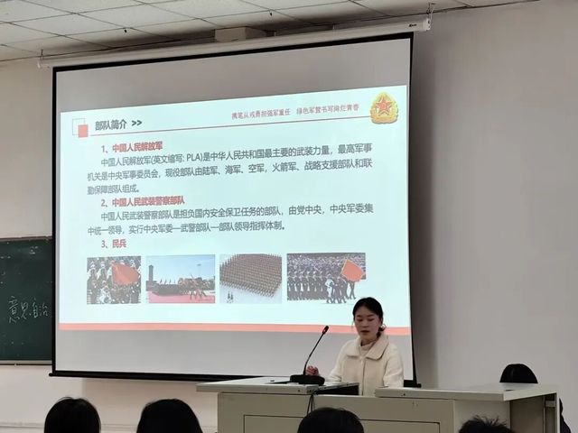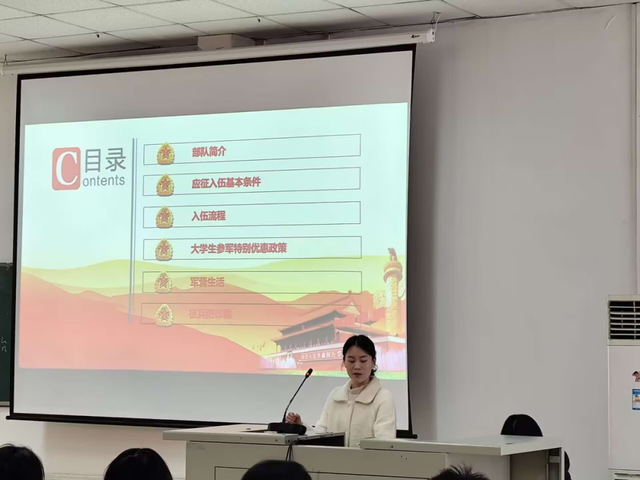 紧接着,退伍军人现2022级思政2班学生杨春红播放了征兵宣传片,展示了热血军旅生活画面。她从部队简介、应征入伍基本条件、入伍流程、大学生参军特别优惠政策、军营生活、征兵防诈骗六个方面详细介绍征兵活动。