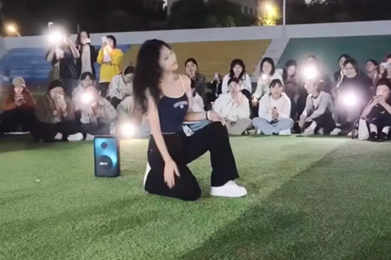 随着夜幕降临,活动正式拉开帷幕。2024级思想政治教育3班席翔率先登场,一段节奏感十足的B-box瞬间点燃全场氛围,鼓点与节拍在操场上空回荡,新生们的欢呼声此起彼伏。紧接着,2024级思想政治教育1班吴菊与2024级思想政治教育2班刘译娇相继带来舞蹈表演,舞蹈热情奔放,感染力十足。两人的精彩演绎将现场气氛推向高潮,新生们纷纷拿出手机记录,掌声与喝彩声接连不断。